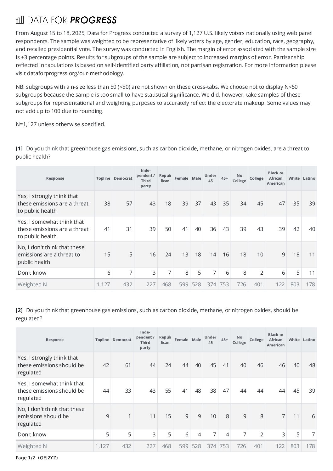Data for Progress – Aug. 2025 Endangerment Finding Crosstabs